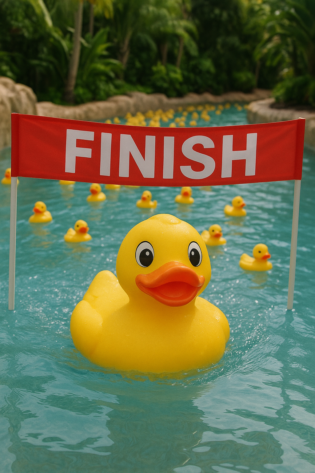 LOADS OF FUN AND EXCITEMENT FOR THE ENTIRE FAMILY. COME CHEER ON YOUR DUCK IN THE GREAT DUCK RACE HELD BY THE KIWANIS CLUB OF BIG LAGOON AND SPLASH CITY ADVENTURES